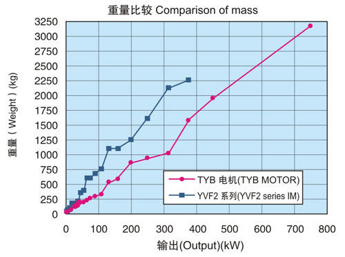 在同一輸出下中心高度比本公司YVF2系列變頻器專用IM下降2格。另外,電機重量也有大幅度減輕。(與本公司YVF2系列變壓器專用IM相比減輕32-57%)