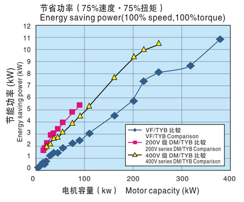 下圖是通過(TYB電機++INV)組合下的綜合效率與(感應電機(IM)+INV)、(直流電機(DM)+直流驅動裝置)的綜合效率之差來表示節(jié)省功率的。