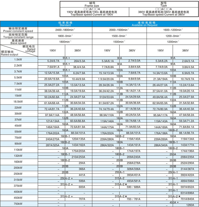 注1) 315kW 375kW 450kW以及750kW中,*標記只表示恒轉矩控制。但是,如果容A從750kW降低到700kW,則可適用于電機轉速范圍1500~1200min-1。 (700kW 1500/1200 min-1 1101/1170A)